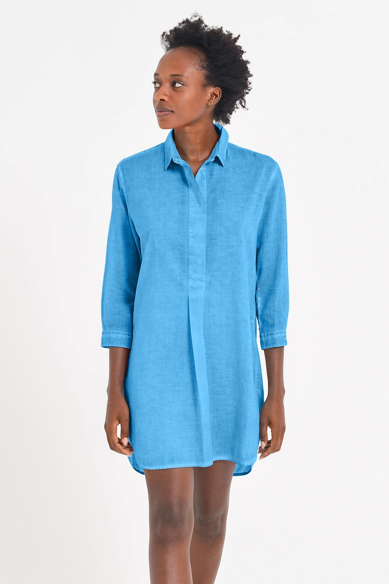 Femme and flowy this Azure Blue mini shirtdress in cotton (voil) features a button-front silhouette with 3/4 sleeve and an extremely light touch.