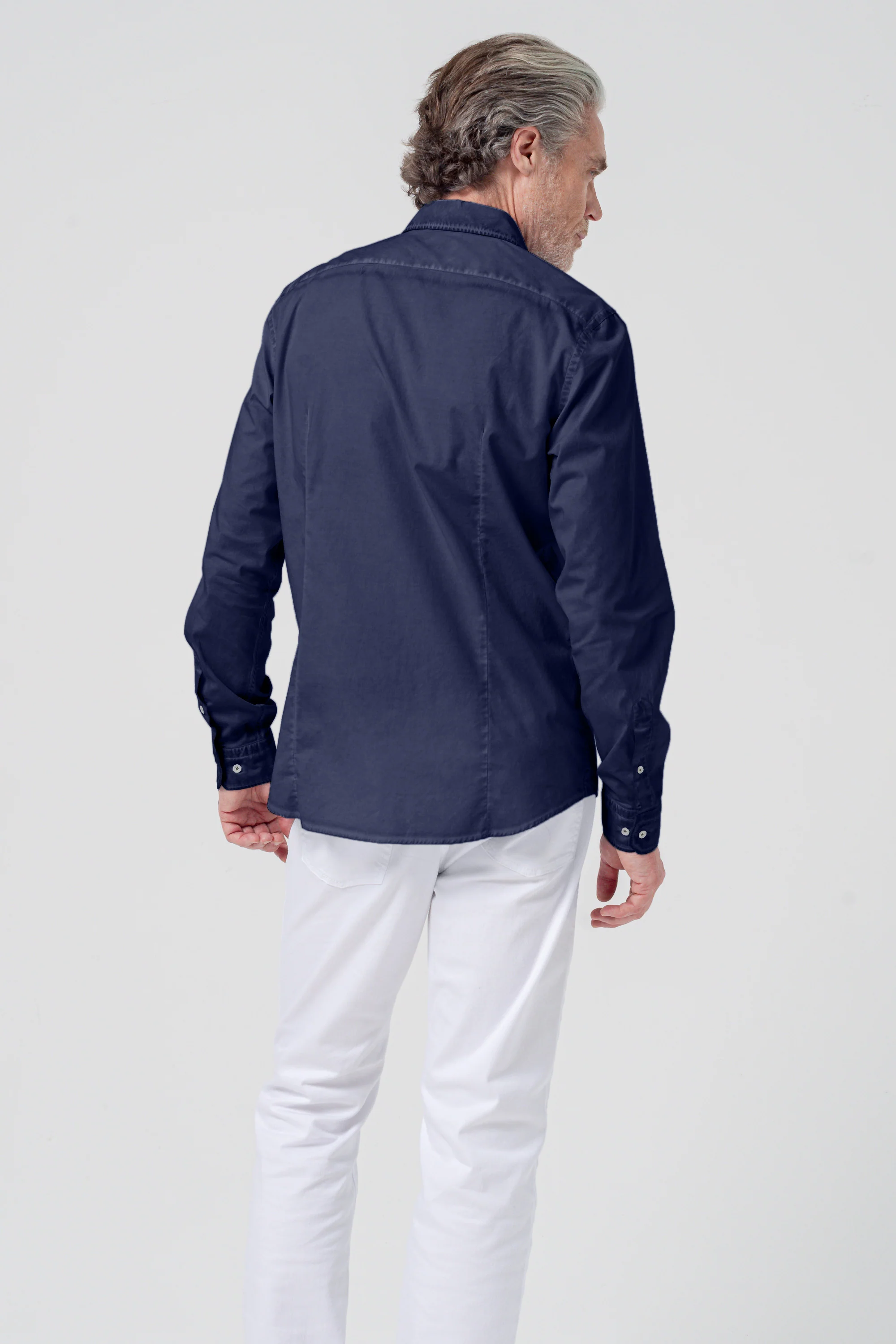 Slim-fit shirt made from poplin cotton. Features a spread collar, long sleeves, and darts in the front and back. Colored using a rainbow technique for a vibrant, distressed effect with some details left untouched. Fabric is stretchable for added comfort.