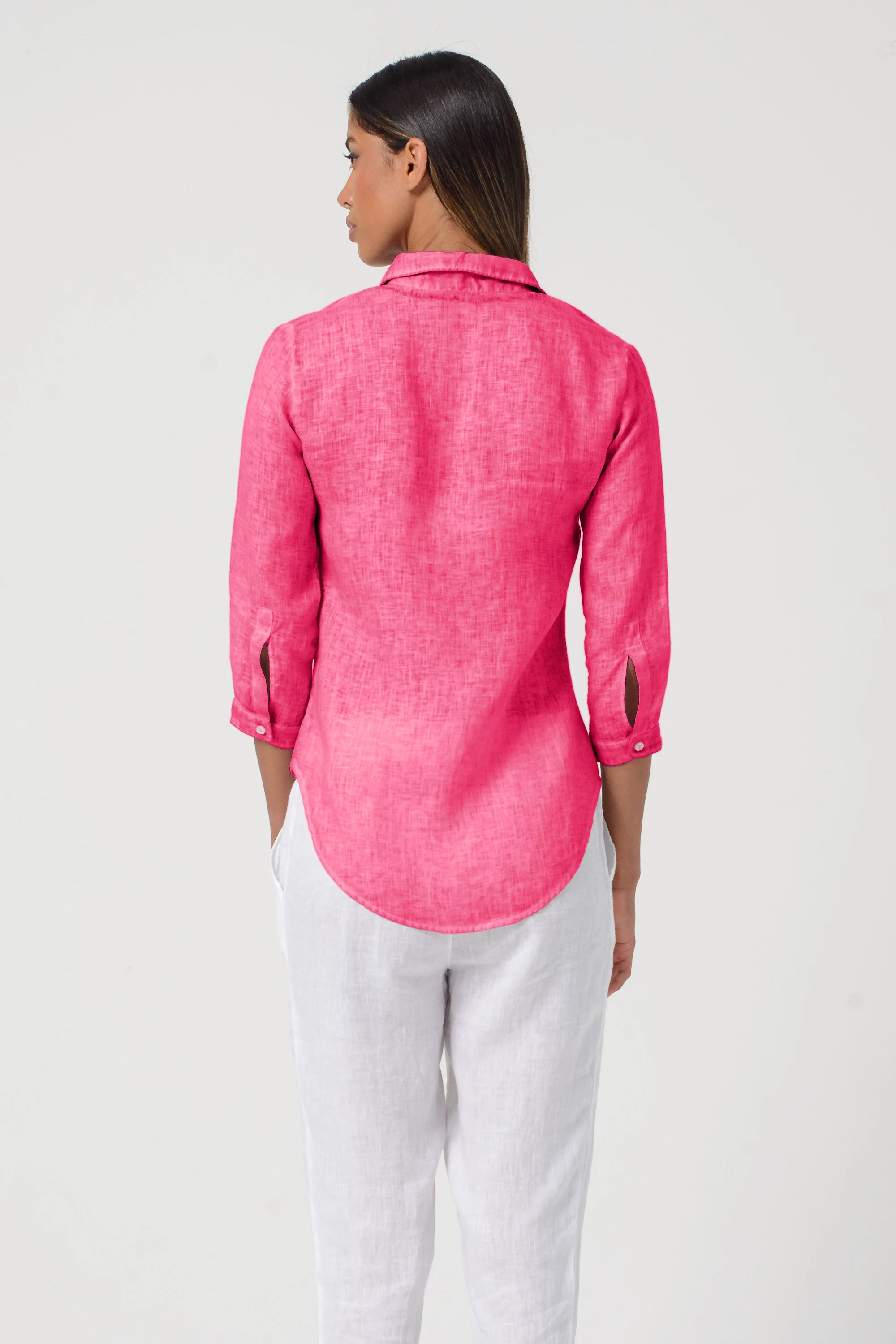 Slim fit linen shirt featuring an Albany collar and 3/4 sleeves. The shirt is colored using a rainbow technique with layered pigments for a vibrant, distressed effect, leaving some details lightly untouched.