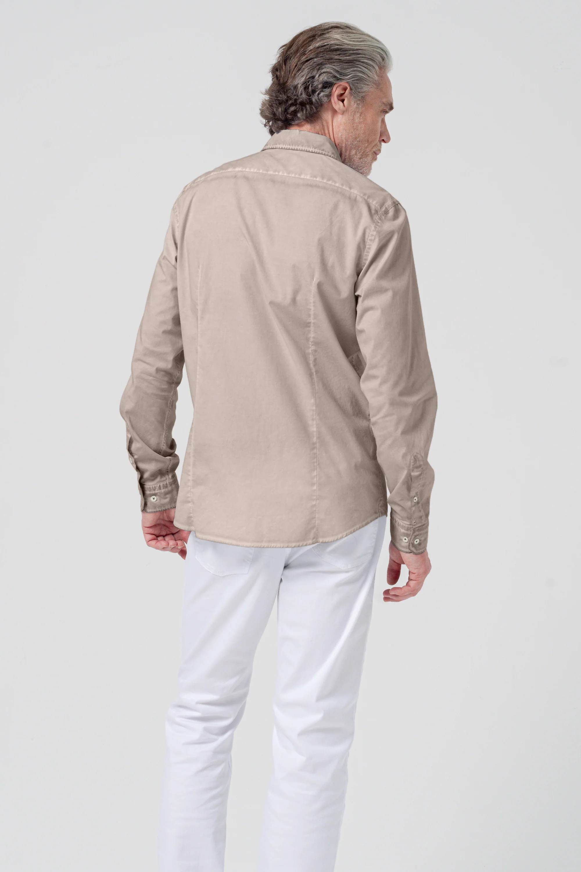 Slim-fit shirt made from poplin cotton. Features a spread collar, long sleeves, and darts in the front and back. Colored using a rainbow technique for a vibrant, distressed effect with some details left untouched. Fabric is stretchable for added comfort.
