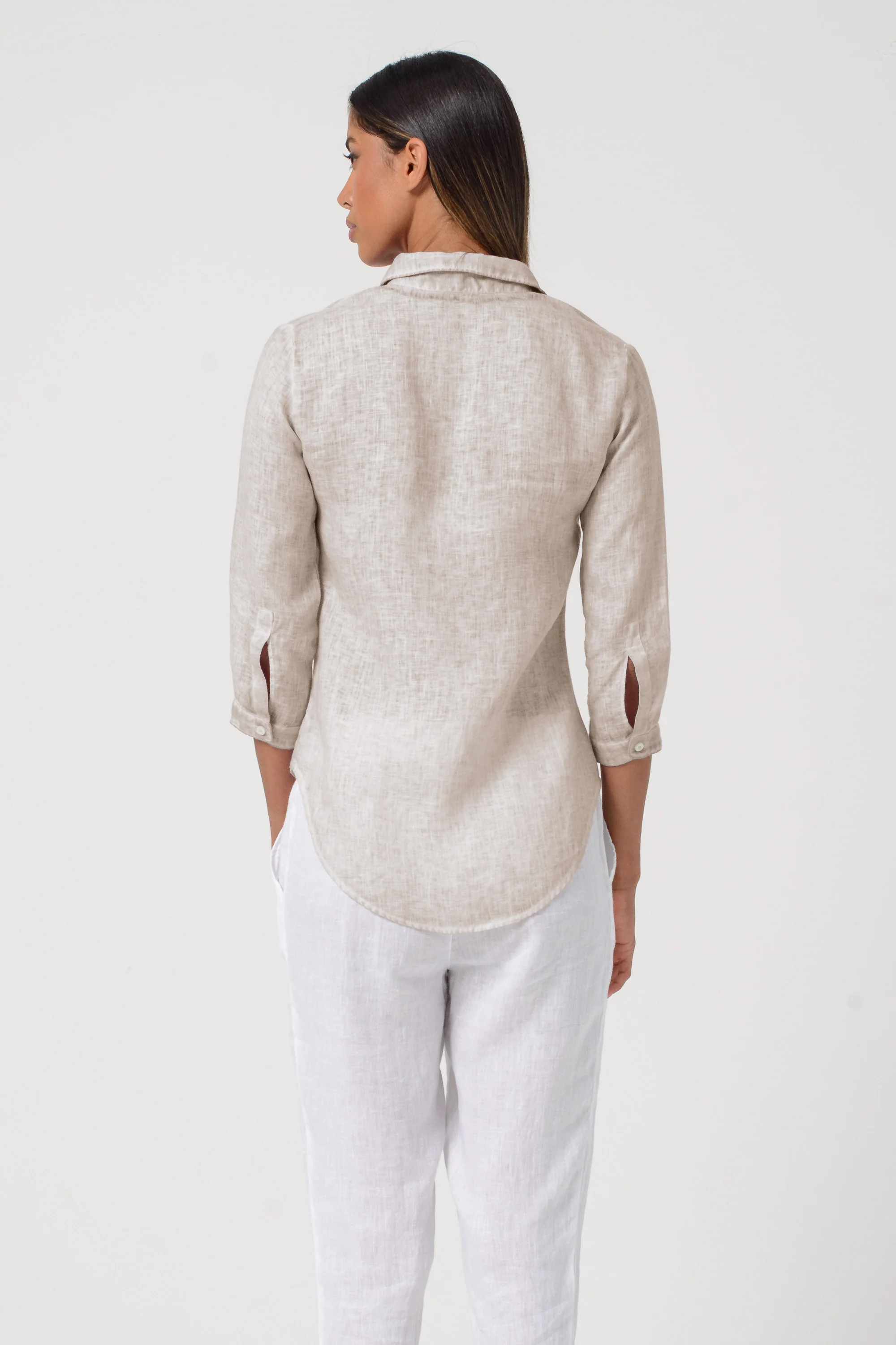Slim fit linen shirt featuring an Albany collar and 3/4 sleeves. The shirt is colored using a rainbow technique with layered pigments for a vibrant, distressed effect, leaving some details lightly untouched.