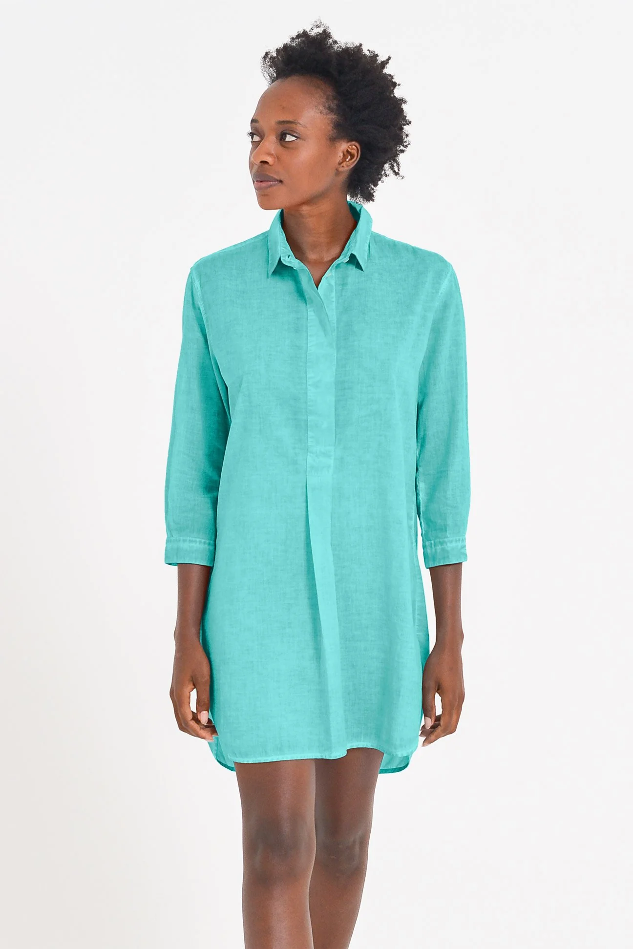 Femme and flowy this Turquoise mini shirtdress in cotton (voil) features a button-front silhouette with 3/4 sleeve and an extremely light touch.