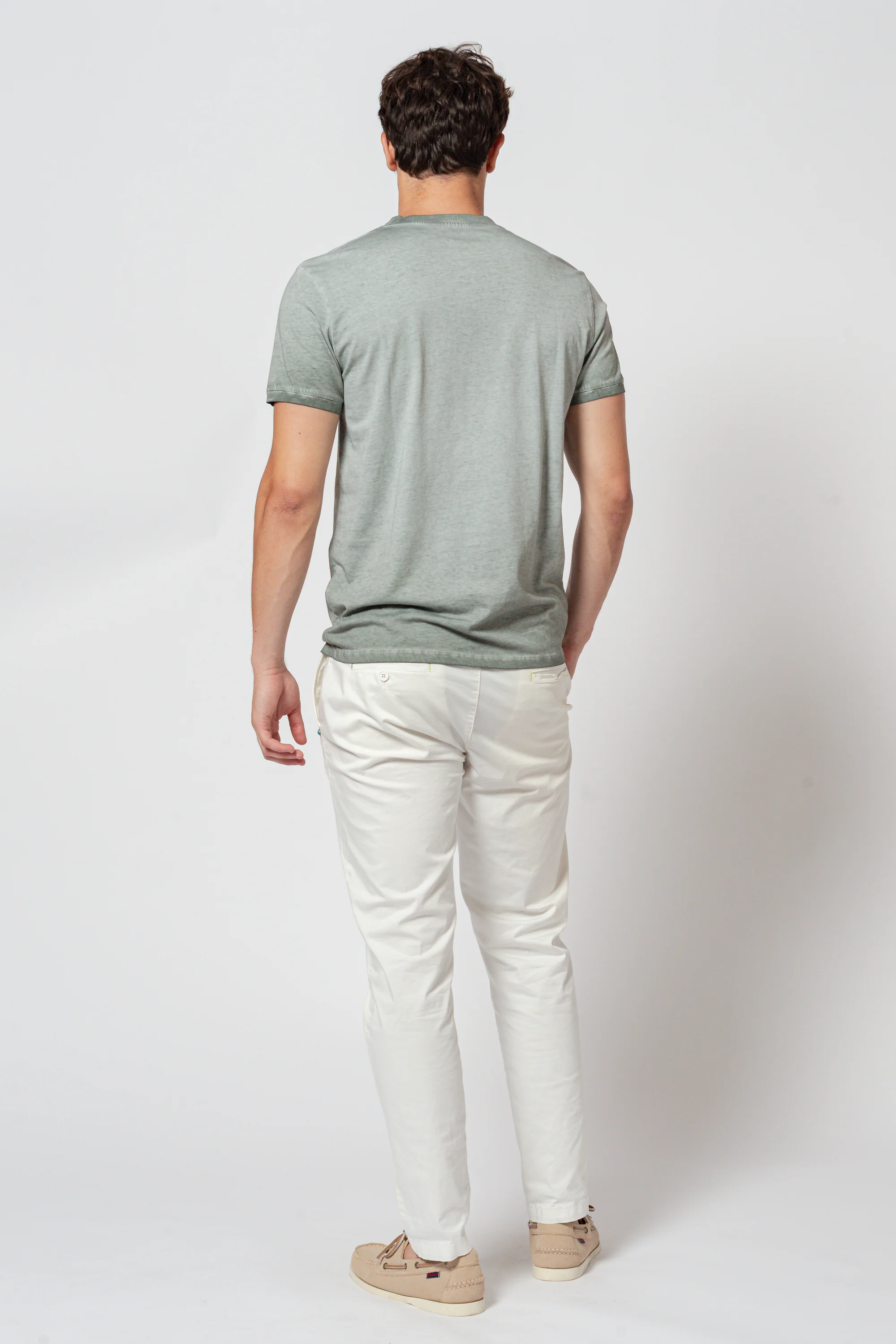This T-shirt features a crew neck and short sleeves, made from breathable cotton jersey. It has a faded appearance and is colored using a rainbow technique with layered pigments for a distressed effect, leaving some details lightly untouched.