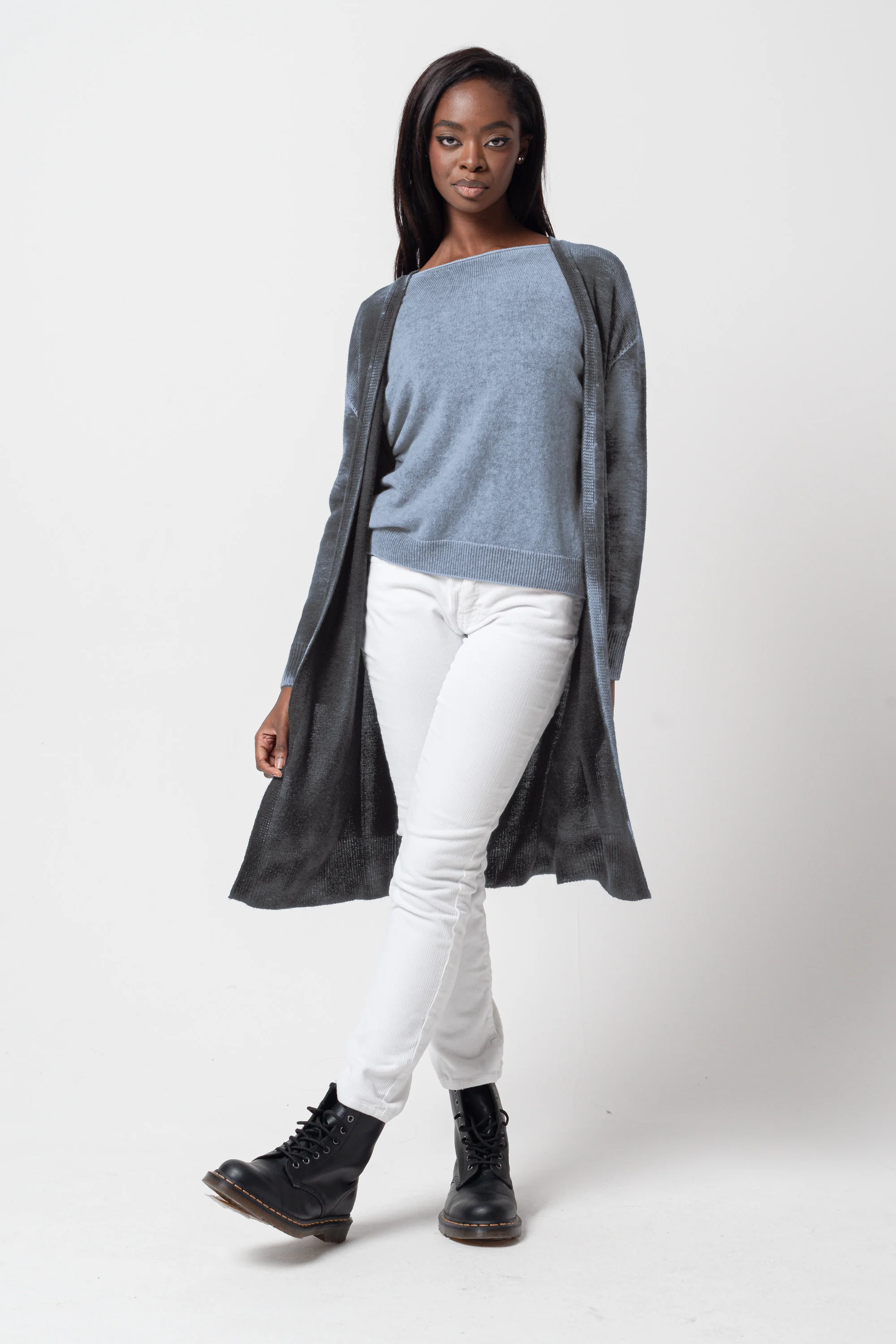 This cardigan features a regular fit and is made from extra fine merino wool. It has an open front, long sleeves, and a knee-length design. The color is applied using a hand-painted technique, and it does not include buttons.