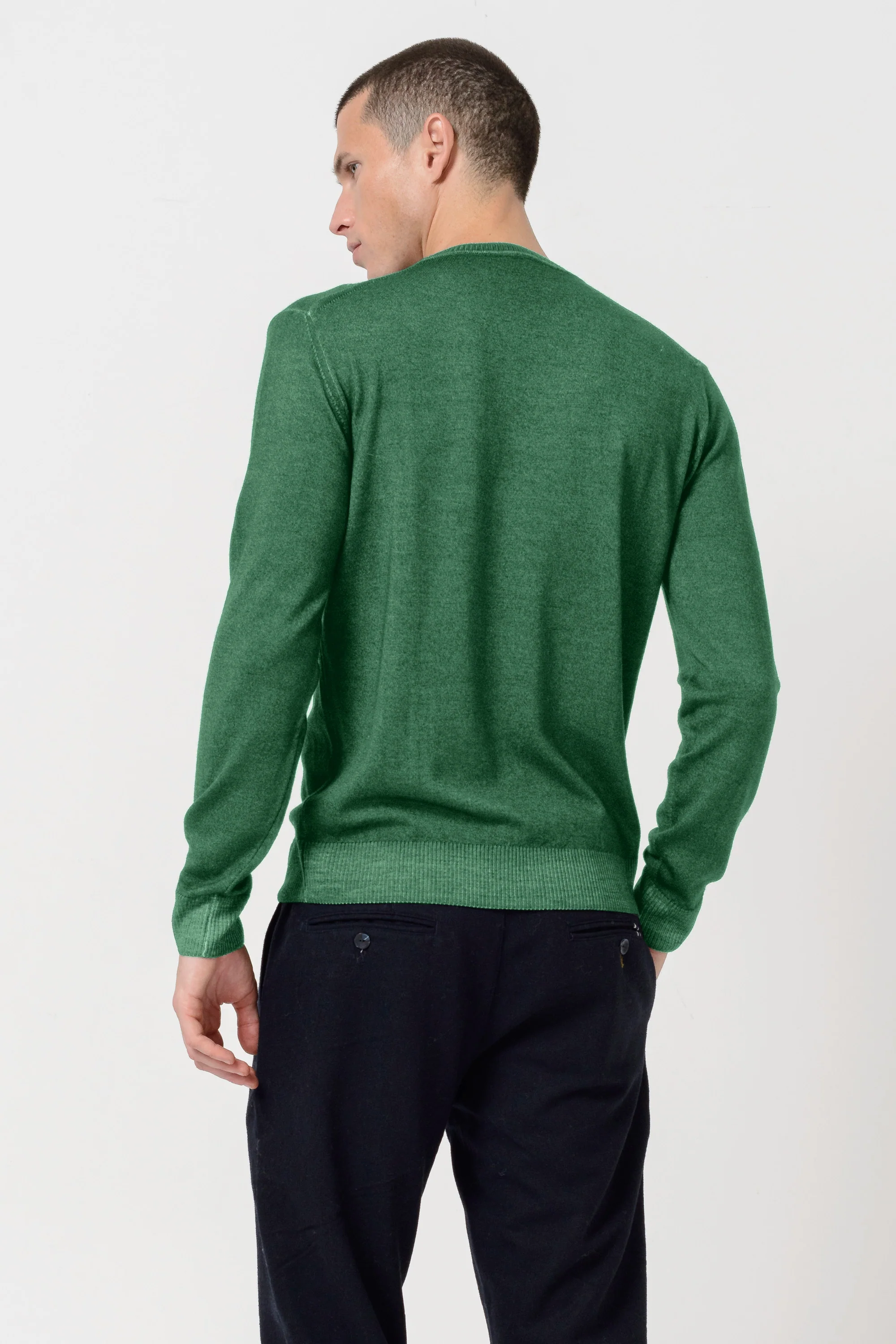 Regular fit sweater made from extra fine Merino wool. Features a crew neck and long sleeves. Colored using the Chroma coloring process for rich color with a hint of brine.
