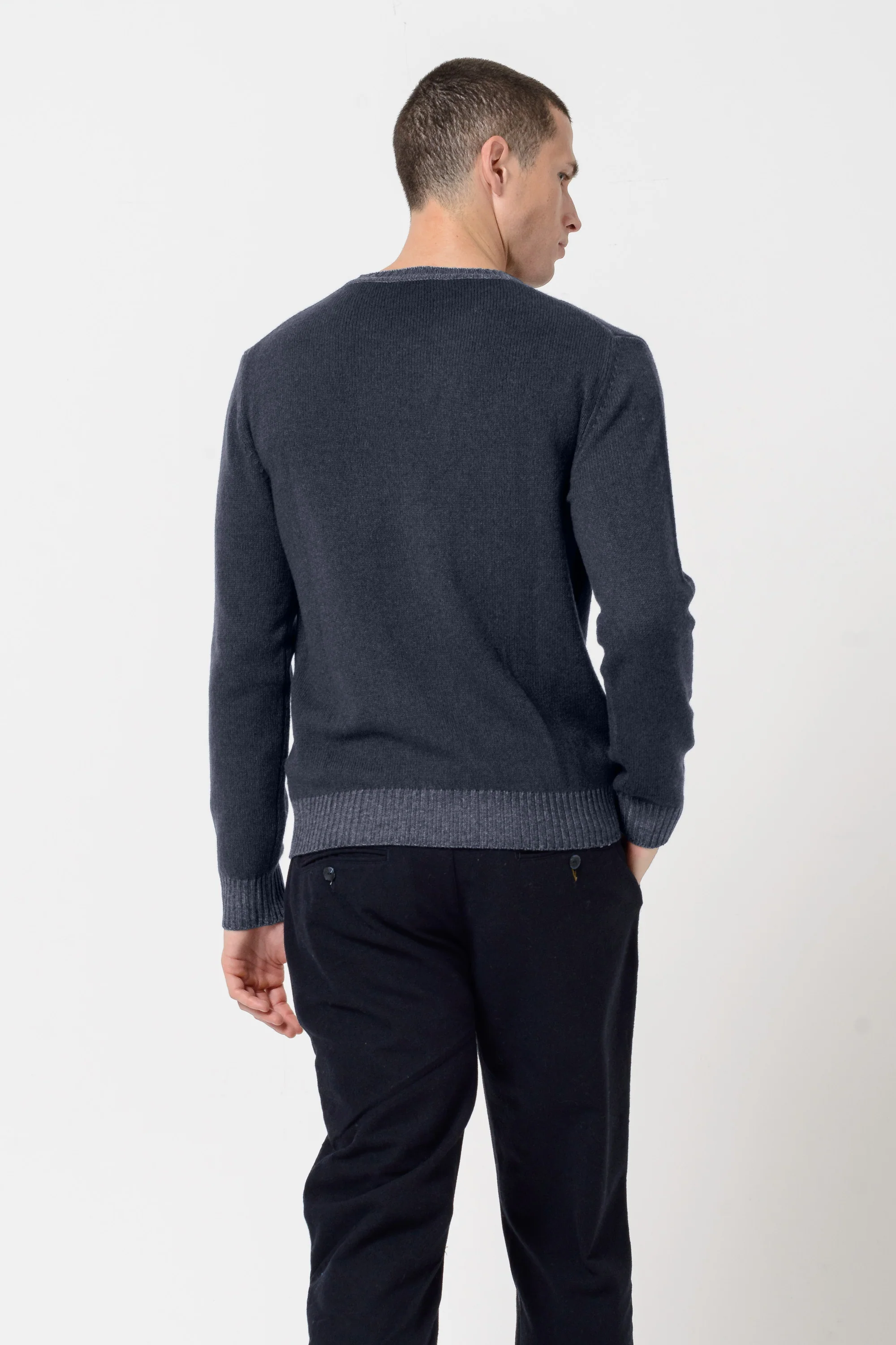 Regular fit sweater made from a cashmere blend. Features a crew neck, long sleeves, and ribbed trims. Colored using the Chroma coloring process for rich color with a hint of brine.