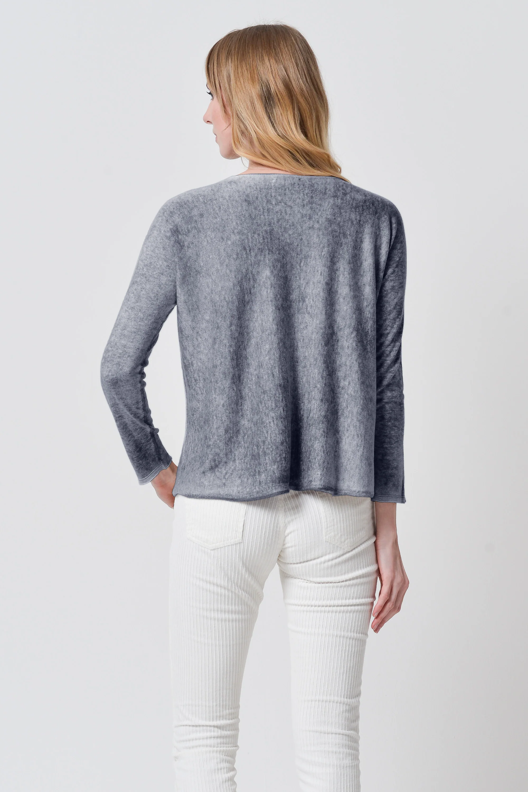 Loose fit sweater made from a silk-cashmere blend. It features a boat neck, long sleeves, and a seamless design. Cropped length. Colored using a spray-painted technique.