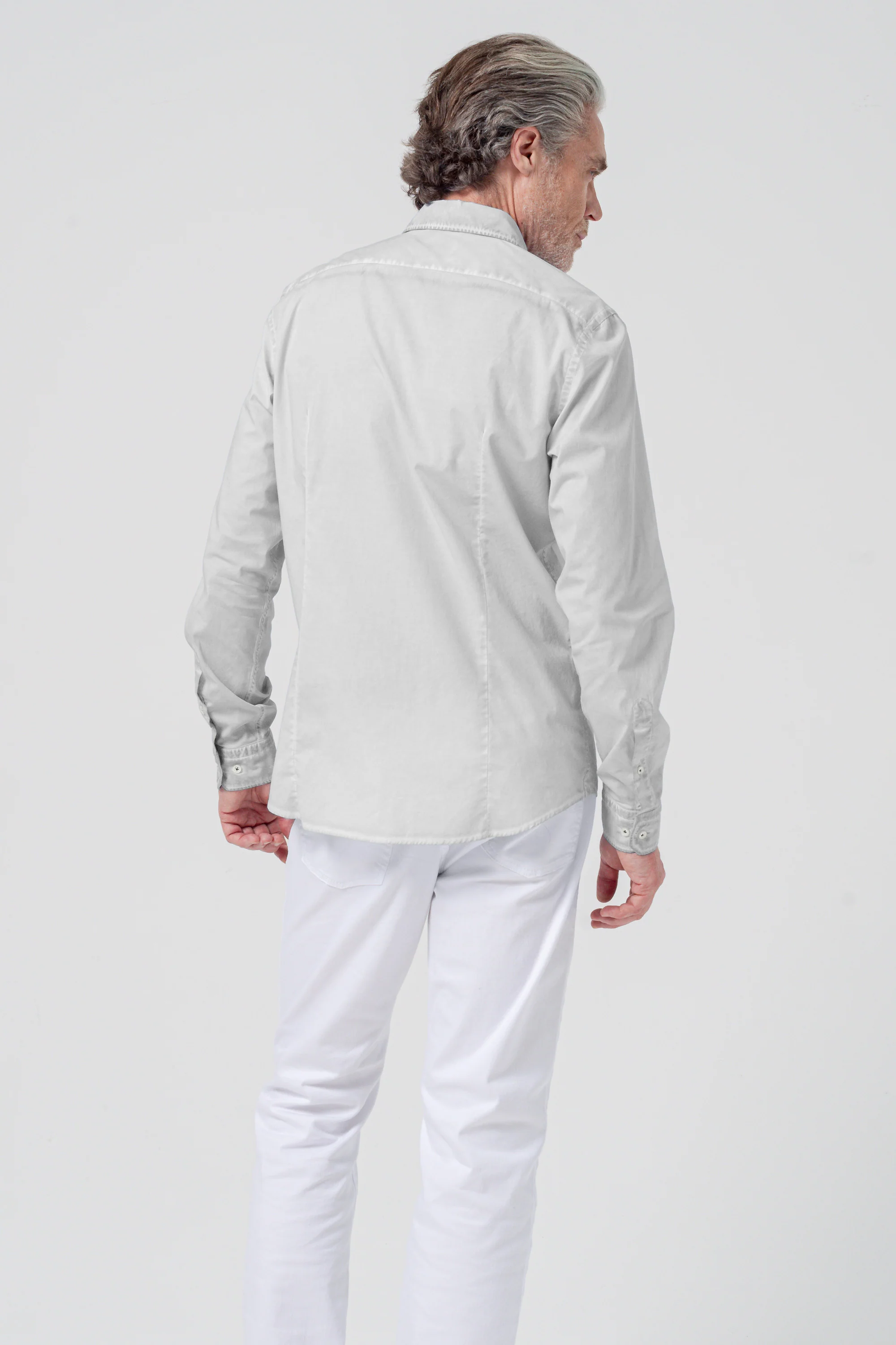 Slim-fit shirt made from poplin cotton. Features a spread collar, long sleeves, and darts in the front and back. Colored using a rainbow technique for a vibrant, distressed effect with some details left untouched. Fabric is stretchable for added comfort.