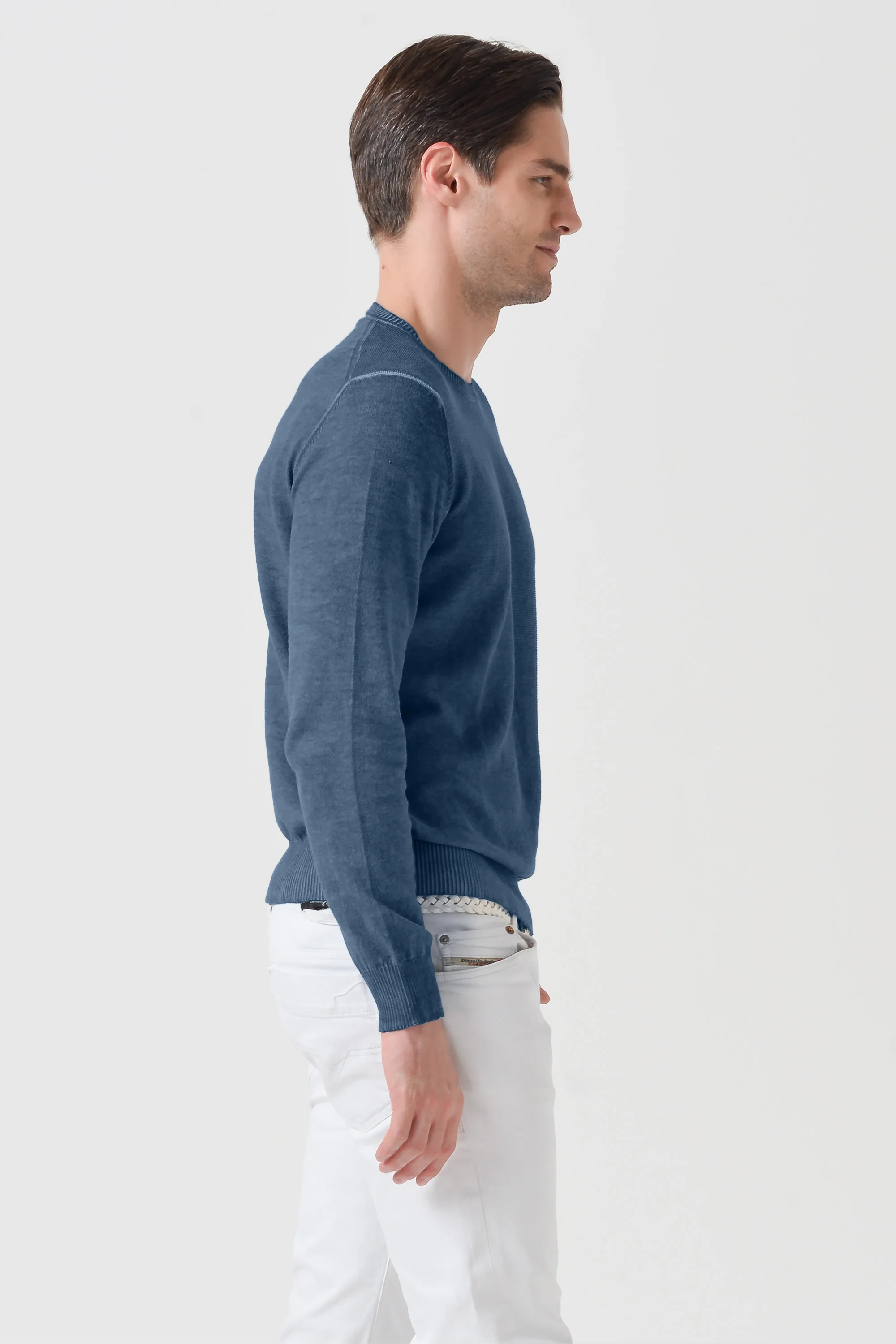 Regular fit cotton sweater featuring a crew neck and long sleeves. The front side has a textured design. It is colored using a rainbow technique with layered pigments for a vibrant, distressed effect, intentionally leaving some details lightly untouched.