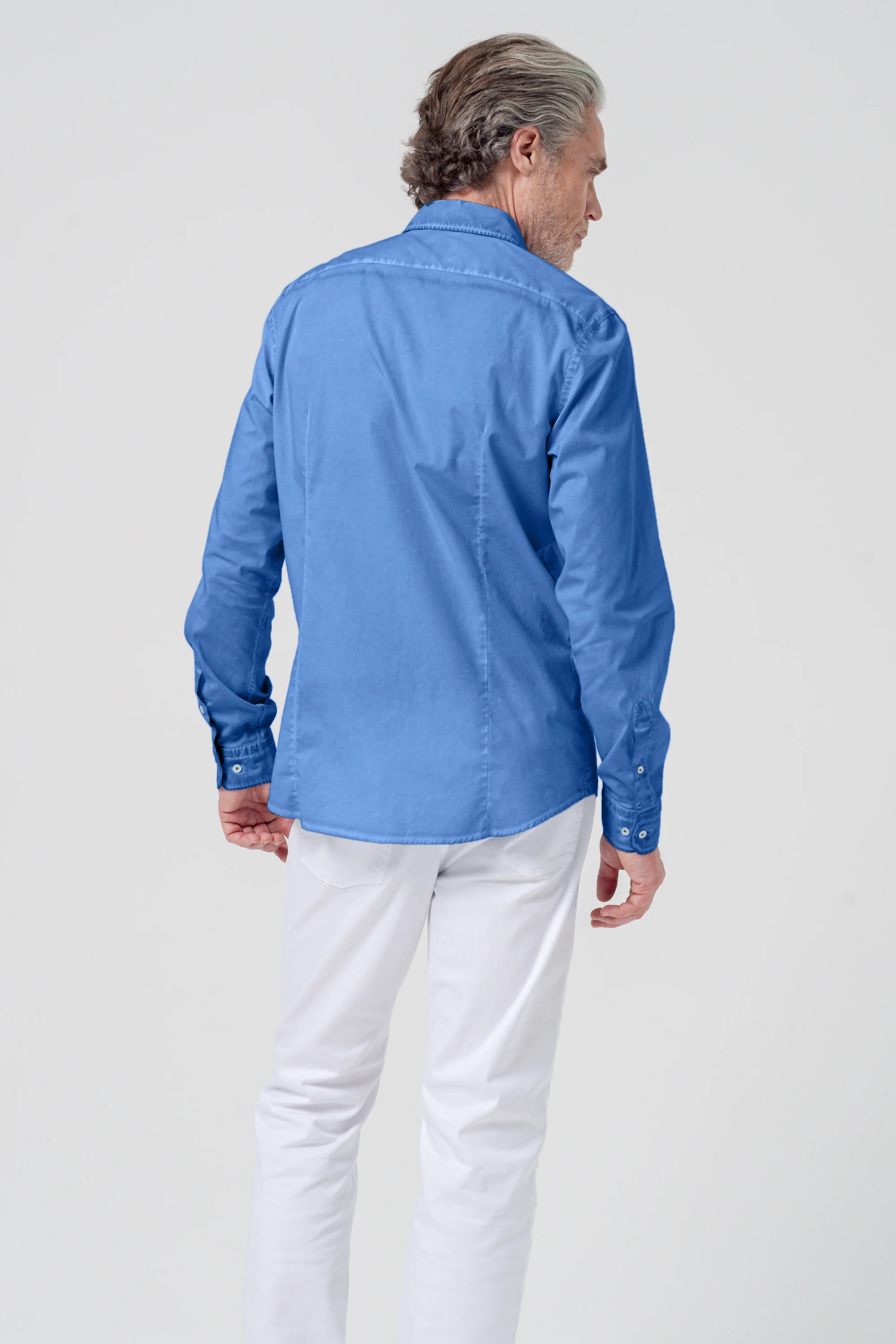 Slim-fit shirt made from poplin cotton. Features a spread collar, long sleeves, and darts in the front and back. Colored using a rainbow technique for a vibrant, distressed effect with some details left untouched. Fabric is stretchable for added comfort.