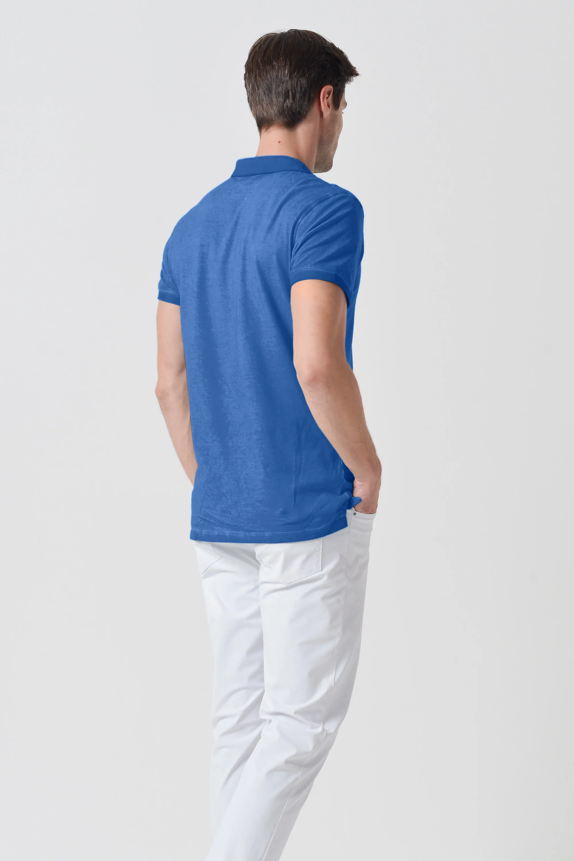 Slim fit polo made from pique cotton. Features a polo collar, short sleeves, and a two-button collar. Colored using a rainbow technique with layered pigments for a vibrant, distressed effect, leaving some details lightly untouched.