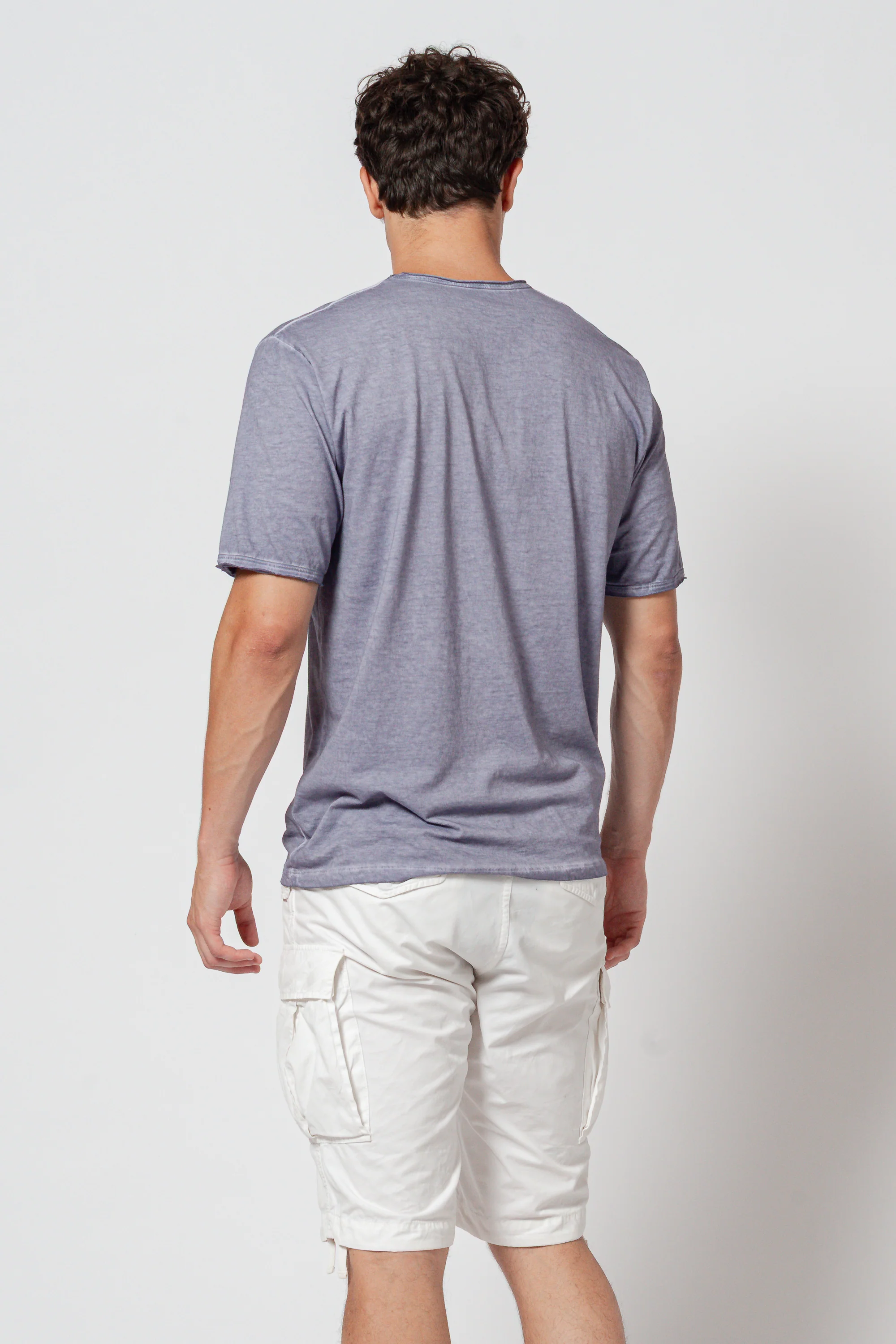 Regular fit t-shirt made from cotton jersey. Features a crew neck, short sleeves, and a chest pocket. Colored using a rainbow technique with layered pigments for a distressed effect, leaving some details untouched. Breathable material.
