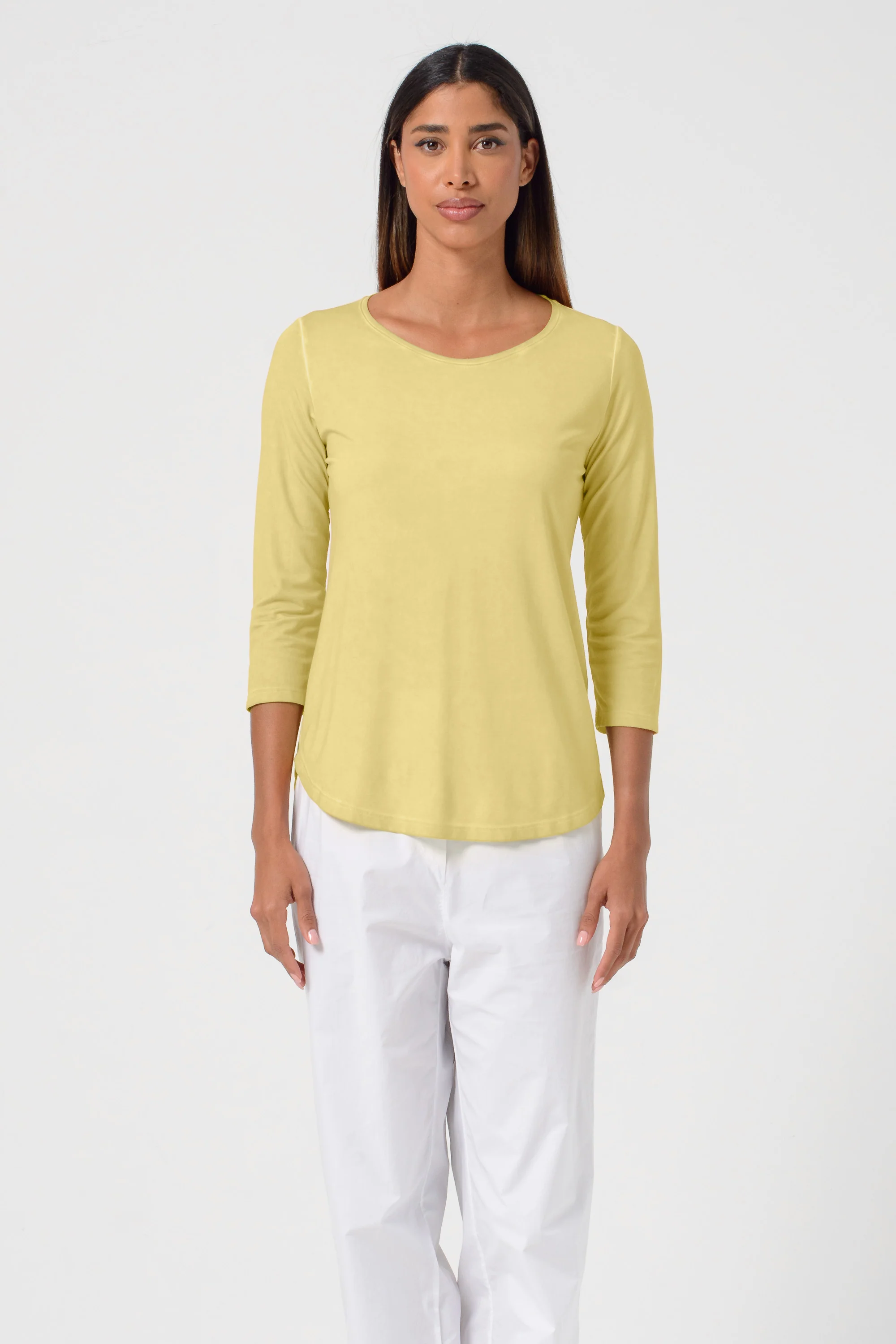 This light and comfortable T-shirt is made from a fine viscose jersey. The 3/4 sleeves are elegant, the slightly loose fit flatters the silhouette, and the crew neckline is guaranteed to highlight your assets. Wear yours with your favorite jeans or shorts by day and with a pair of heels for an evening event. This T-shirt will be your “go to” companion for many years to come.