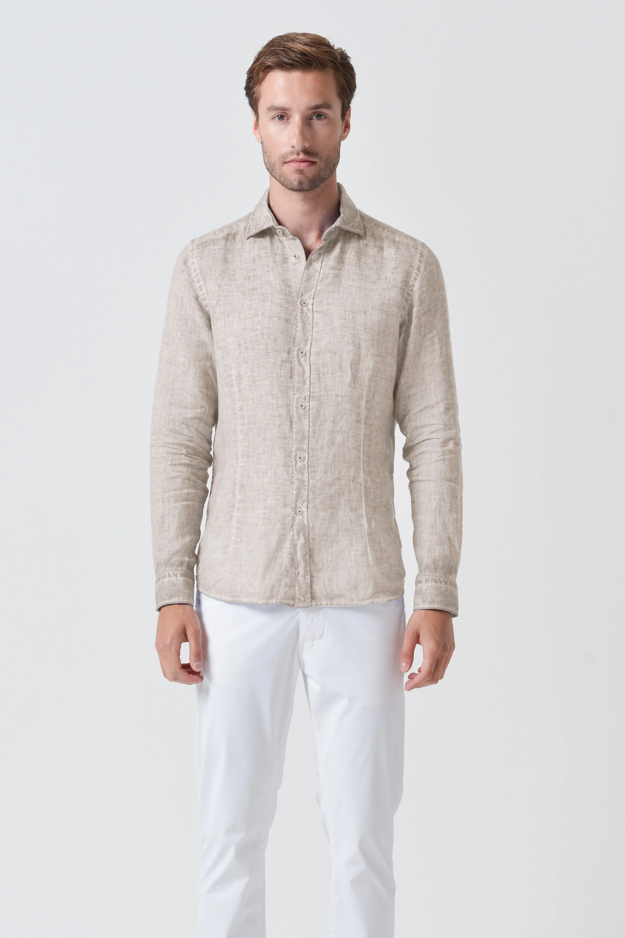 Slim fit linen shirt with spread collar, long sleeves, and darts into the front and back. Colored using rainbow technique for a vibrant, distressed effect. Breathable and intentionally left details lightly untouched for visual intrigue.