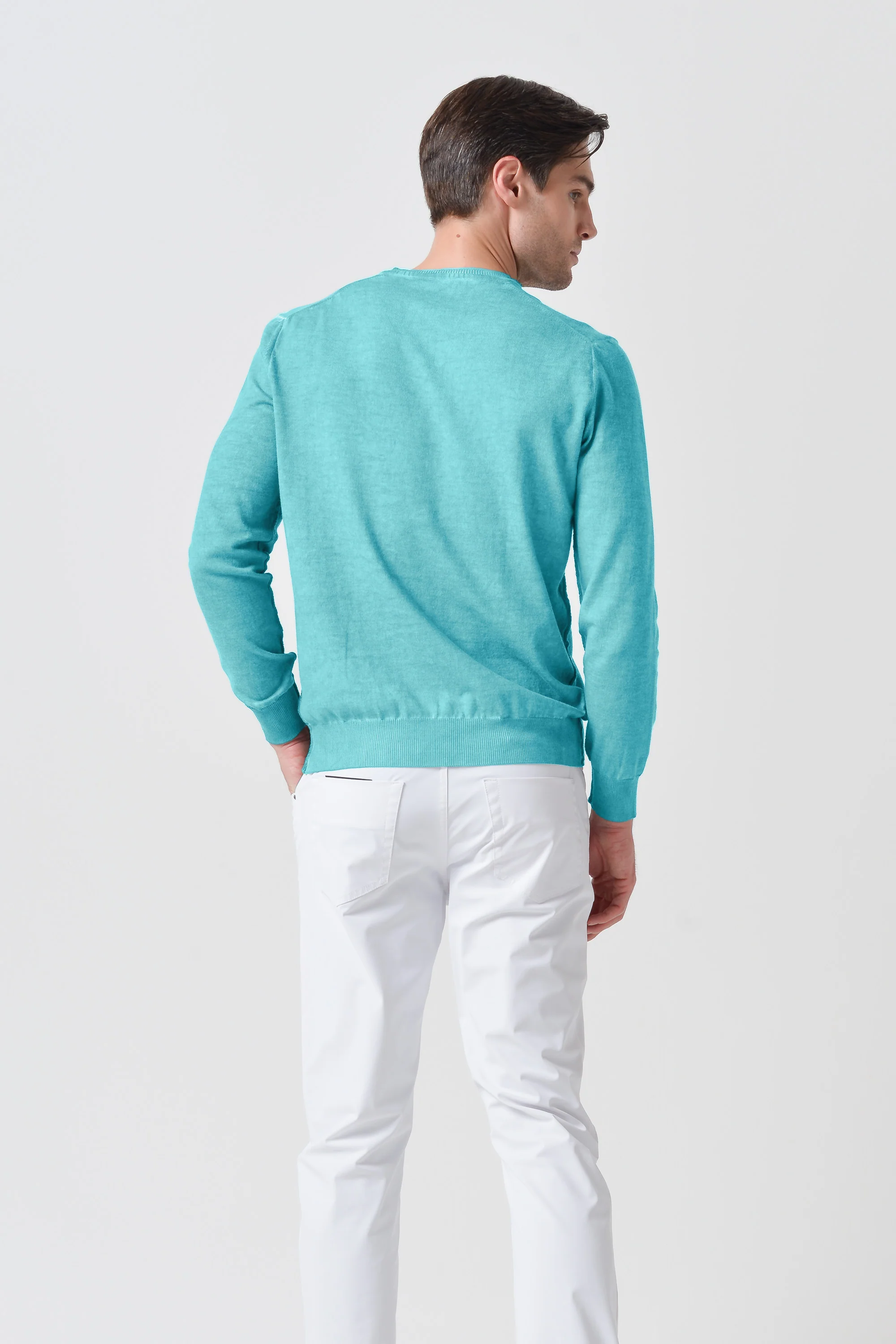 Regular fit cotton sweater with a V-neck, long sleeves, and ribbed collar hem and cuffs. Colored using a Rainbow technique for a vibrant, distressed effect, with details intentionally left lightly untouched.
